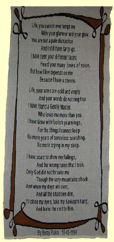 Click Here to read the Poem “Life” written by Betty Pukis which is knit into this memory blanket