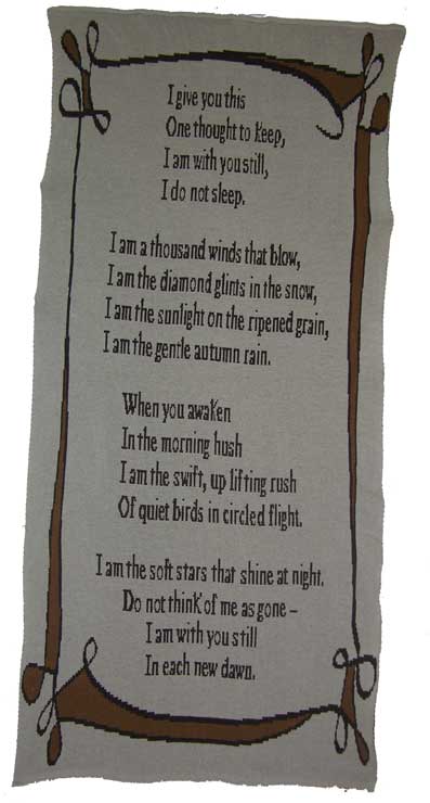 Order the Life Blanket in our Online Catalog or Contact Us if you would like a Memory Blanket with your own Poem Verse or Message Contained. This blanket has the maximum space allowed, but smaller 1 verse lap blankets can be ordered for less cost dependant upon size.