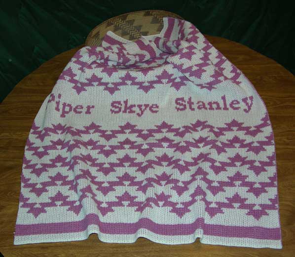 Knit baby clothes personalized with names and knit in your color choices can be ordered in our online store catalog. These baby layettes make perfect heirloom gifts for baby showers. We offer other categories of logo knits for business and clubs. Knit blankets, caps, scarves, sweaters, and much more can be hand loomed with your logo or special design. Native American Designs and Symbols are Personalized in Flag Blankets and many other knit gifts.