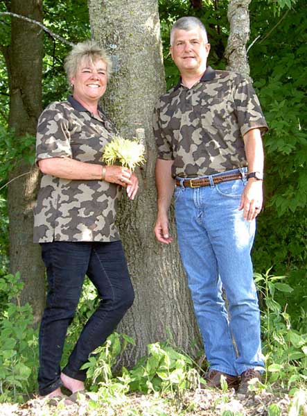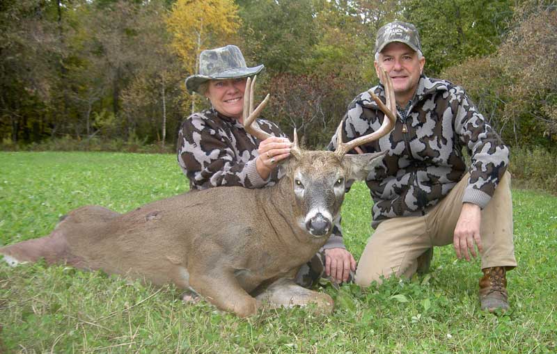 Scott Smolen ~ Wi ~ 2010 Oct ~ 12 pointer deer, Scott is wearing the Winona Camo Fatigue sweater in this photo | Lori Smolen enjoys bow hunting too and got this nice 8 pointer in the field in the photo. Lori wears Winona Camo Too! Lori is wearing the Winona Camo Fatigue sweater and Scott is wearing a Winona Camo Cardi Jacket | This isn't a deer hunting photo, but Scott and Lori obviously love Winona Camo to wear these fabric Winona shirts on their Wedding day, sorry we don't carry the fabric Winona products - just the Winona Knit Camo |