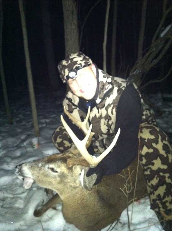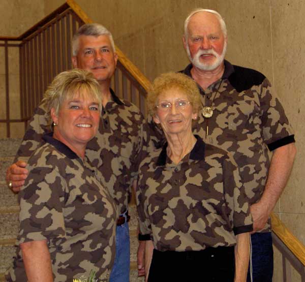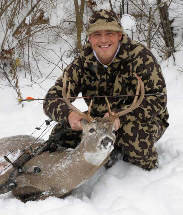 Bob and Betty Fratzke stand up for Scott and Lori Smolen at their wedding, all dressed in Fratzke Camo Wear | Scott Smolen is still hunting those big bucks in his Winona Camo in 20l1 | Matt Howe says "On the last day of hunting season during the last minutes of daylight look what walked near! Our camo was completely silent in below freezing temps and kept me toasty, allowing me to send an arrow through this 8 point. " |