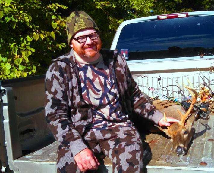 Bill Hansen wearing his Elite Winona Camo Jacket with his Floppy hat on a successful hunt day after Thanksgiving 2015. Bill says "Your knit camo is the most comfortable in the industry hands down. The floppy hat is my all time favorite hunting hat.2015." | Jason Wilborn wearing original brown winona camo made by Bob Fratzke on a successful hunt. The deer was harvest with a bow on 10/08/2014 in Tennessee. |