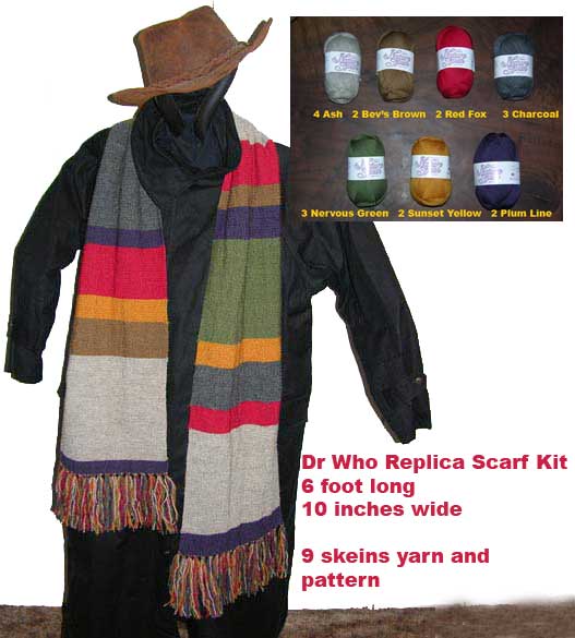 Knit the 15 Foot Replica of the Dr Who Scarf worn by Tom Baker in the TV series Dr Who with the full size Season 12 Dr Who Yarn kit pictured at the left. The knitting pattern gives directions for knitting the 15 foot or two knit scarves at 7.5 feet each or three knit scarves at 5 feet each.