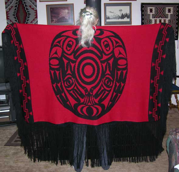 The knit fabric is constructed with a 'slip stitch' on the back side to give non stretch stability to the dance shawl and a jacquard slip stitch on the front side to give the vividness of the design. Laying 'flat', this fabric measures 38" in depth and approximately 60" length (hand to hand) dependent upon the motif and yarn fiber. The 38" depth does not include the 18" length fringe. This jacquard stitch construction fabric is identical to our 2 color Native American Blankets, which are often worn as Robes without the fringe.